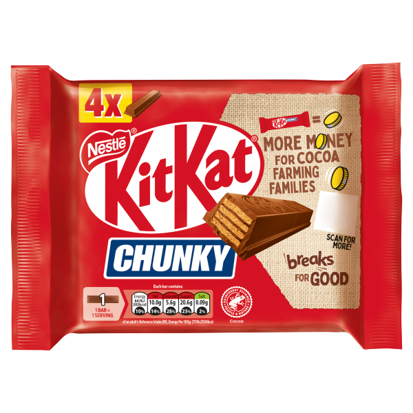 Kitkat Chunky Milk Chocolate 4 Pk Pmp 1.85 Pack & Size : 24(4X32G) Pallet Qty : 144 Layer Qty : 0 Product Code : 12623711 - + Add to Quote