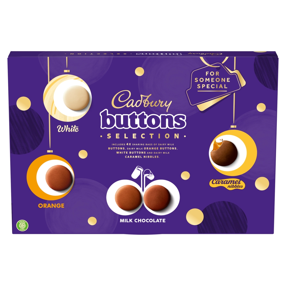 Cadbury Buttons Selection Box 340g Pack & Size : 7X340G Pallet Qty : 66 Layer Qty : 11 Product Code : 4310943 - + Add to Quote